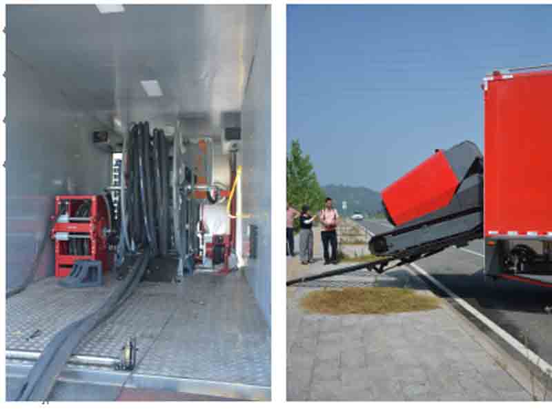 移動排水泵站及液壓系統(tǒng)放置室:車廂中段用于停放液壓裝置、液壓油箱及放置油管絞盤。車廂后門為下開式,行車時作為后門,保護車內(nèi)設(shè)施,當子車下車時,可作為其階梯,使子車平穩(wěn)上下車。