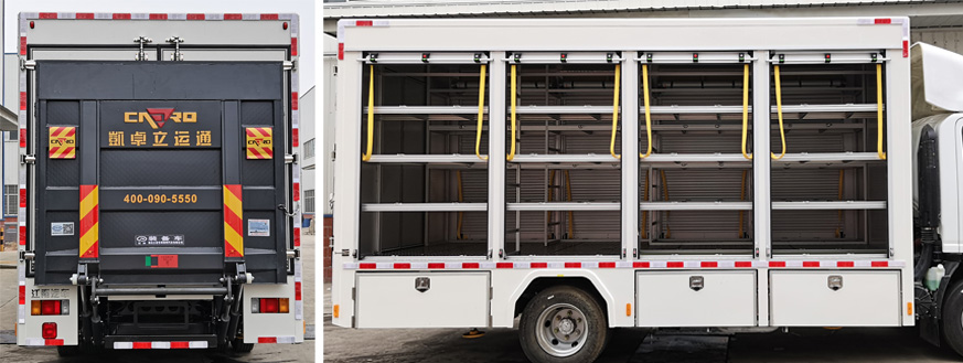 JDF5100XZBQ6型裝備車由底盤、液壓搭橋(尾)板、器材箱等組成,內(nèi)部設(shè)置隔間,可根據(jù)運(yùn)輸設(shè)備的外形尺寸及特點(diǎn)固定、安裝,用于后勤保障,向一線輸送特種裝備。該車系選用慶鈴汽車股份有限公司生產(chǎn)的QL1110ANKAY二類汽車底盤改裝而成,原裝單排駕駛室,可載含駕駛員在內(nèi)的乘員3人,駕乘舒適輕便。該車用于消防救援隊(duì)裝備運(yùn)輸,兩側(cè)卷簾門,車尾安裝搭橋板或1噸垂直升降液壓尾板,搭橋板主要用于機(jī)器人上下車廂;貨物可通過液壓圍板上下車,內(nèi)部根據(jù)轉(zhuǎn)運(yùn)器材的結(jié)構(gòu)進(jìn)行鋁合金器材架的搭建,該車最大的特點(diǎn)是操控性好、維修簡便,可廣泛應(yīng)用于應(yīng)急消防隊(duì)、公安、醫(yī)療衛(wèi)生、廠礦企業(yè)及社區(qū)、碼頭等場(chǎng)所。